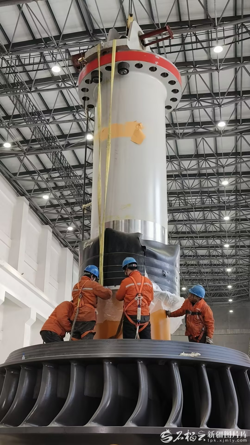 新疆大石峡水利枢纽工程发电厂房内,工作人员正在进行3号机转轮浮动环安装。潘生明摄