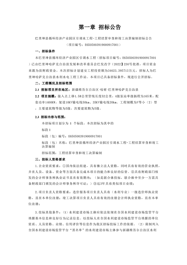 巴里坤县循环经济产业园区引调水工程-工程结算审查和竣工决算编制招标公告