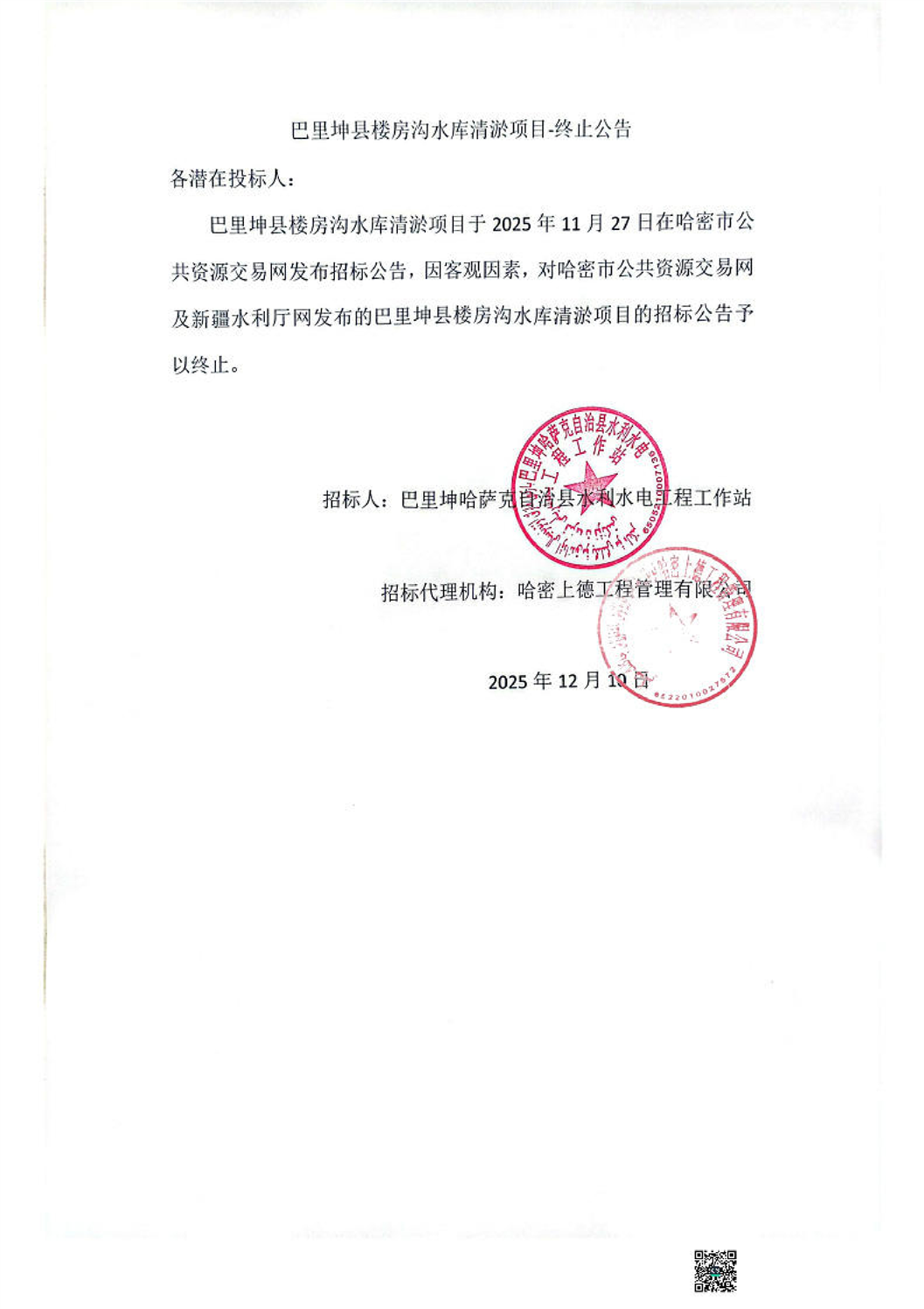 巴里坤县楼房沟水库清淤项终止公告
