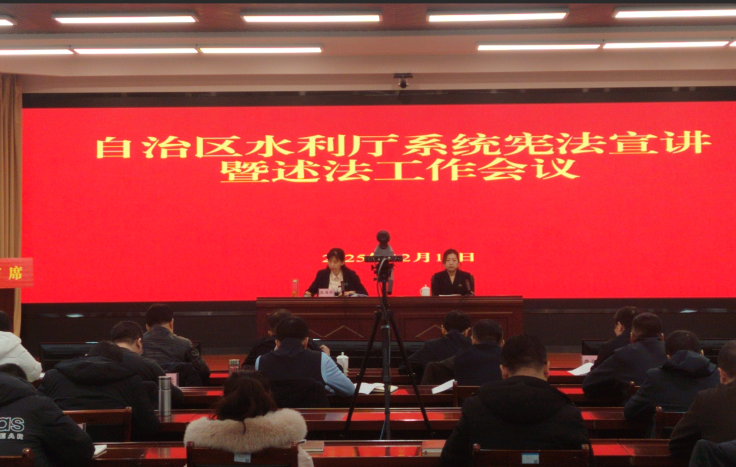 (二)聚焦普法重点,加强学习宣传。一是厅党组带头引领。印发《自治区水利厅党委(党组)理论学习中心组学法制度》,把习近平总书记关于全面依法治国的重要论述列入党委(党组)中心组学习必学内容和各支部(总支)学习教育计划,2025年召开厅党组理论学习中心组专题学习会议、干部大会,专题学习习近平法治思想,重点学习《党章》、中央八项规定及其实施细则等党内法规。二是多种形式开展学习宣传。组织开展“世界水日”“中国水周”“美好生活·民法典相伴”“12.4”国家宪法日、宪法宣传周等系列普法宣传活动。通过举办专题培训班、主题宣讲、党日活动等形式,加强国旗法、国歌法等与宪法相关法的学习宣传。每年举办新招录人员和新任职领导干部宪法宣誓活动,培养提升尊宪守宪观念。制定水利厅领导干部参加法治培训计划,积极组织参加自治区“法治讲堂·逢九必讲”法治培训,覆盖水利系统副处级以上领导干部和水行政执法人员,2025年6次被新疆维吾尔自治区党委依法治疆办表扬。